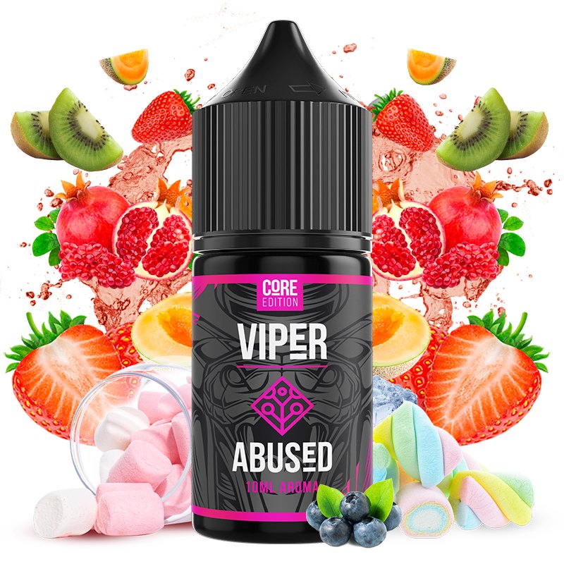 El aroma MiniLongfill Abused de Viper Core Edition ofrece una fórmula perfeccionada para el deleite de los amantes de los frutales con un núcleo de fresa y melón, un estallido de granada, kiwi, frutas del bosque y malvavisco.